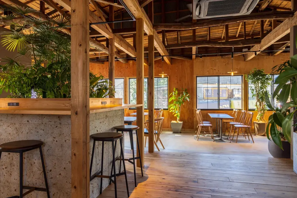 仙石原の古民家カフェ。木の温もりとグリーンを基調とした開放的な空間で本格コーヒーやオリジナルのルデラバーガー、足柄牛のラグーパスタなど多国籍のメニューを提供。Wi-Fi完備、2階席はコンセント付き、テラス席はペット用リードフックあり。