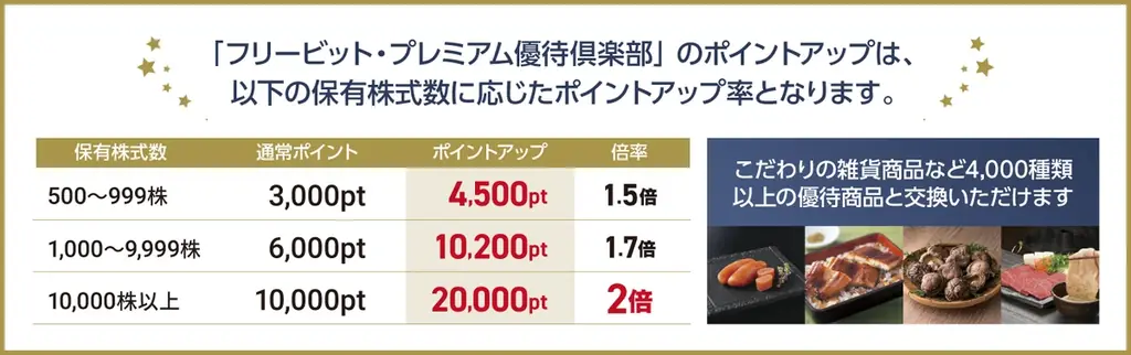 - 株主が毎年4月末日時点で10,000株以上を保有している場合に「フリービット・プレミアム優待倶楽部」のポイントアップ率が2倍になります。ポイントアップ率は保有株式数に応じた3段階です。