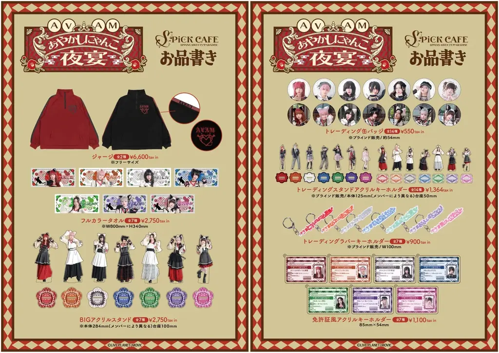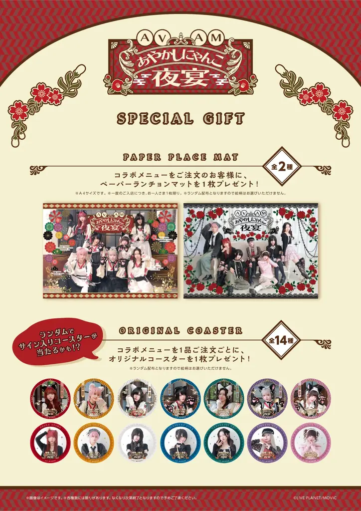 次回コラボはグループ名を冠したイベントタイトル『AVAM あやかしにゃんこ夜宴』。ハロウィンの要素を取り入れた猫耳のモチーフと、大正ロマンを意識した着物にエプロンを組み合わせた限定カフェ衣装がビジュアルの軸となります。さらに今期の新作を交えたSPINNS衣装の展示やメンバー考案のオリジナルメニューの提供、等身大パネルの展示など、視覚的にも体験としても充実した演出を予定していることが公表されています。