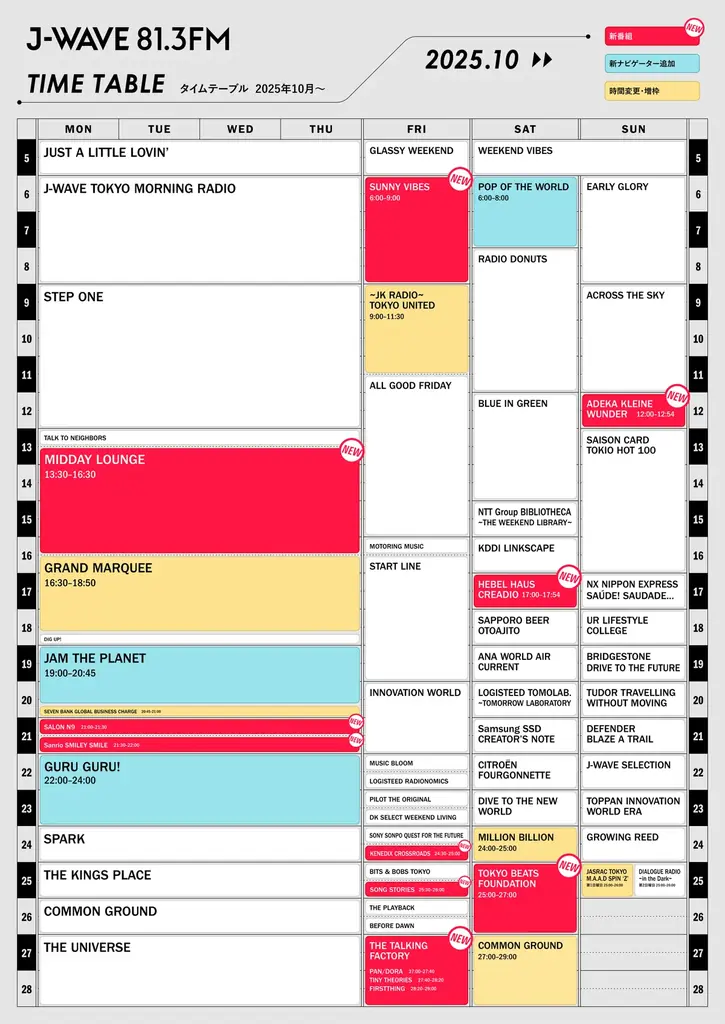 この表は新設番組とその要点を集約したものです。加えて、既存番組のナビゲーター交代(『JAM THE PLANET』『GURU GURU!』等)や放送時間変更(『MILLION BILLION』ほか)が発表されています。改編後のタイムテーブルは色分け(赤:新番組、黄:時間変更、青:ナビゲーター変更)で公開されます。