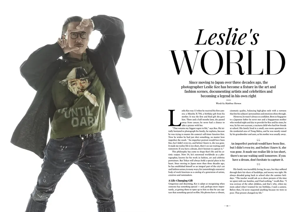 インタビューでは、レスリー・キー自身の経験として、若き日に母親の写真を撮れなかったことへの痛切な後悔が語られています。この経験が彼の写真観に大きく影響し、「夢があるなら、迷わず今シャッターを切るべきだ」という言葉に結実したと説明されています。誌面からは情熱と喪失、創造へ向かう道筋が浮かび上がります。