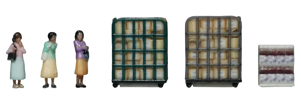 「スーパー前」は、ガチャ(カプセルトイ)を販売する自動販売機「ガチャマシン」や買い物客、カゴ車などをセットにした情景を再現した製品です。ガチャマシンはタカラトミーアーツの実機を取材して極小カプセルまで再現している点が注目されます。