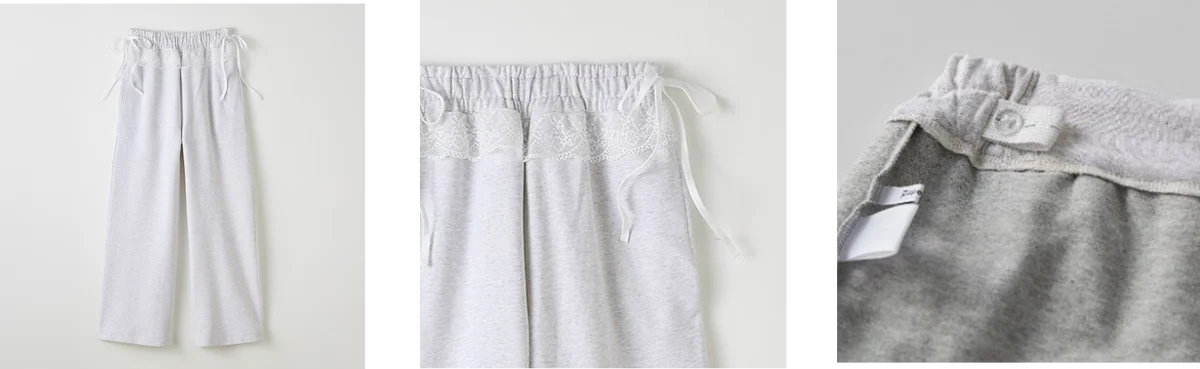 サイドリボン レースデザイン コットンスウェット ワイドストレートパンツ