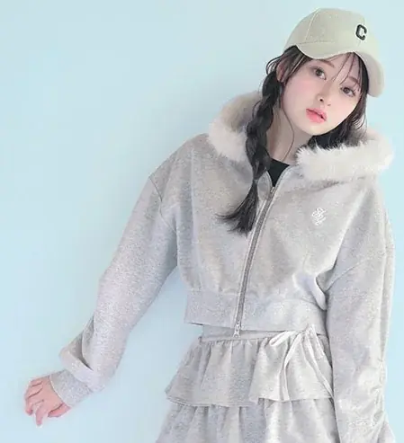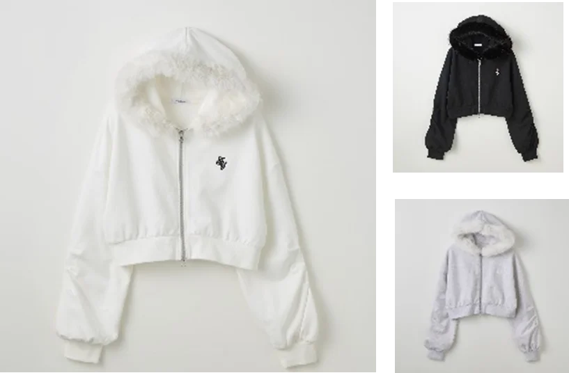 商品構成 | 取り外しフェイクファー付きショート丈ジップパーカ、インナーパンツ付きティアードミニスカート、サイドリボンレースデザインワイドストレートパンツ |