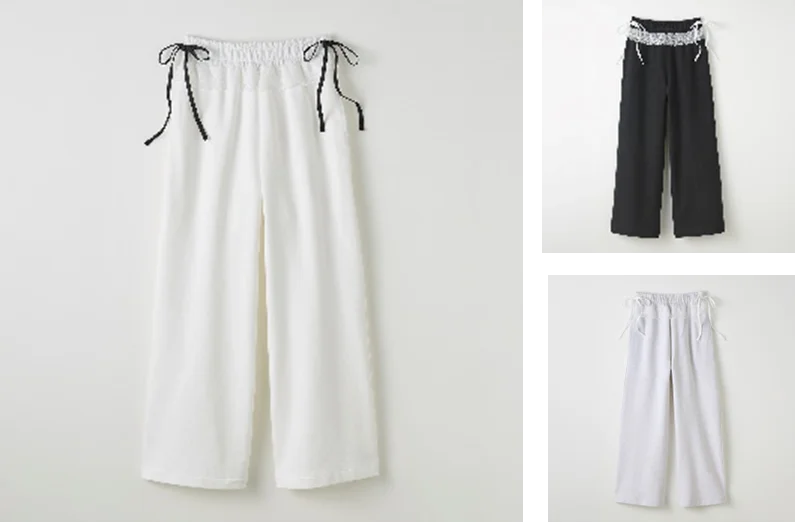 シルエットにこだわったワイドストレートのパンツです。ウエストにレースとサイドリボンをあしらい、程よい甘さをプラスしました。オフホワイトとホワイト杢グレーには裏地を付け、透けにくさに配慮しています。
