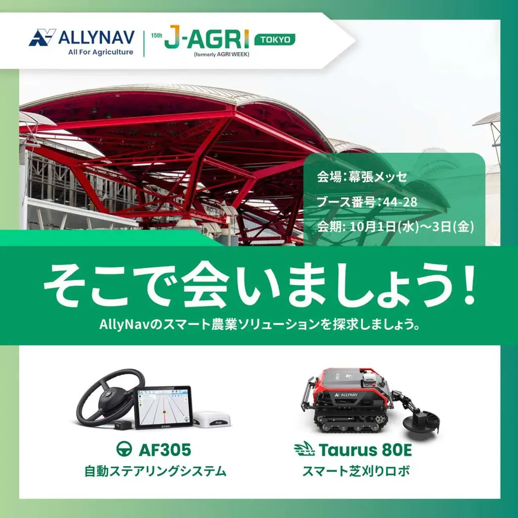 Shanghai AllyNav Technology Co., Ltd(以下、ALLYNAV)は、国内戦略パートナーである株式会社マゼックスとともに、第15回農業WEEK(J-AGRI TOKYO)に出展し、自動草刈り機「Taurus80E」と自動操舵システム「AF305」を中核とするスマート農業ソリューションを披露します。本出展は、2025年10月1日(水)〜3日(金)に幕張メッセで開催され、ALLYNAVは10ホール・ブース番号44-28に出展します。