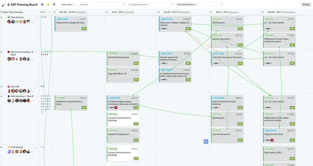 複数のアジャイル・チームの作業とその依存関係を、2週間単位のイテレーションで時系列に可視化するプランニング・ボードを提供します。視認性・操作性に優れ、ワーク・アイテムの実施時期、担当チーム、ワーク・アイテム間の依存関係をカンバンビューで表示できます。
