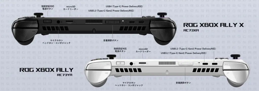 インターフェースはゲームプレイ中の操作に配慮して上部に配置されています。ROG Xbox Ally(RC73YA)にはUSB3.2 Type-C(Gen2/PD/映像出力対応)を2ポート搭載、ROG Xbox Ally X(RC73XA)にはUSB4 Type-C(PD/映像出力対応)とUSB3.2 Type-C(Gen2/PD/映像出力対応)を搭載しています。
