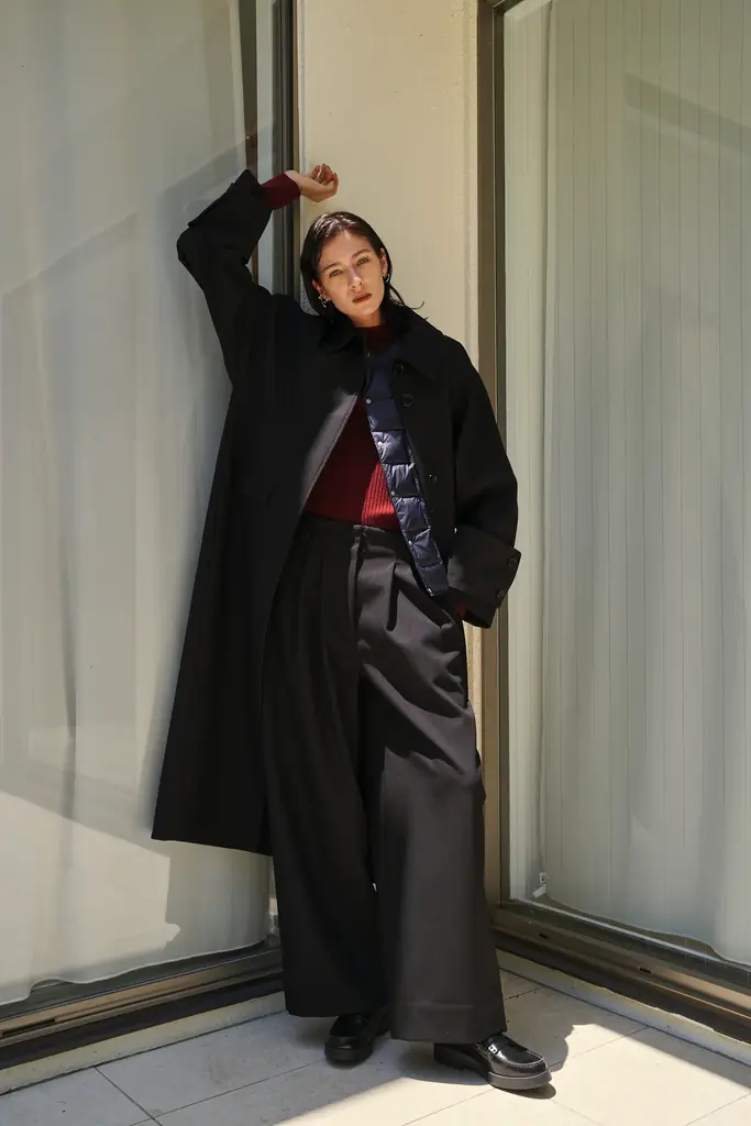 ELENDEEKが重視するフォルム設計により、ステンカラーコートは上品さと遊び心のバランスを保つ設計です。インナーダウンを装着した際のフォルムの変化を設計段階から織り込み、すっきりとしたシルエットと暖かさを両立しています。
