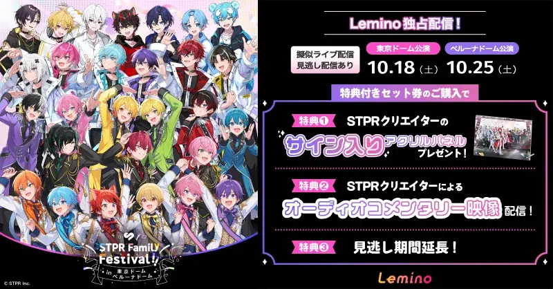 株式会社STPRは、2025年4月に東京ドームとベルーナドームで開催した大型フェス『STPR Family Festival!!』のライブ映像を、NTTドコモの映像配信サービス「Lemino」にて独占で配信すると発表しました。配信はペイパービュー(PPV)方式で、東京ドーム編は2025年10月18日(土)18:00開演、ベルーナドーム編は2025年10月25日(土)18:00開演となります。