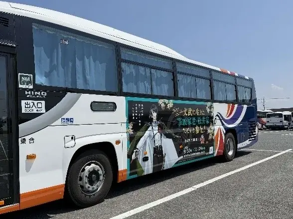 コラボを記念して、展覧会告知を施した「刀剣男士 松井江」リムジンバスが会期中、2025年11月24日(月・祝)まで運行しています。車両には展覧会告知が描かれており、地域内での周知に活用されています。