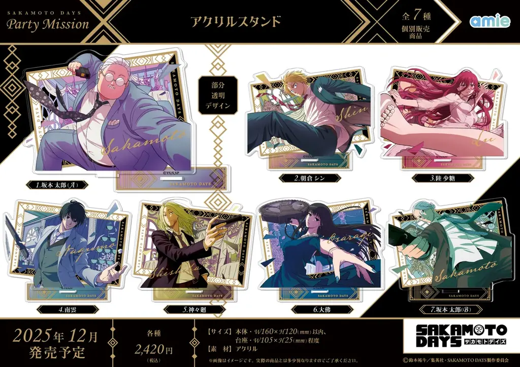 フィギュア&ホビー通販大手の大網株式会社が運営するグッズブランドamie(アミィ)より、TVアニメ『SAKAMOTO DAYS』を題材にした描き下ろしシリーズが発表されました。制作側は本企画のテーマを「パーティーでの潜入ミッション」とし、登場キャラクターたちをパーティー会場に溶け込ませつつも、それぞれの個性を活かしたビジュアルで商品化しています。