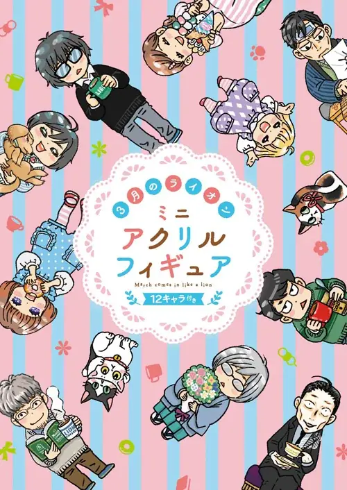 特装版付録はアクリルスタンドフィギュア(ミニサイズ)12体で、零や川本家の三姉妹、島田、二海堂といったキャラクターが羽海野チカ氏によるデフォルメ描き下ろしで収録されます。卓上に並べて『3月のライオン』の世界を再現できるコレクション性が特徴です。