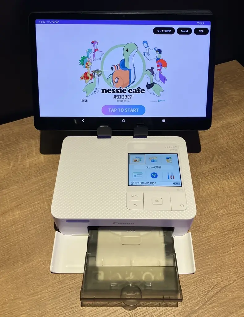このランダムプリントは、コラボメニュー1品ごとに追加300円を支払うことで1枚の限定ステッカーをその場で受け取れる仕組みです。タブレットの画面上で「START」ボタンを押すと、Apex Legends™の世界観を反映したランダム演出が再生され、当選した1枚がSELPHY CP1500からプリントされます。印刷されるまでの時間を単なる待ち時間にせず、来店者の体験価値を高める演出として位置づけています。