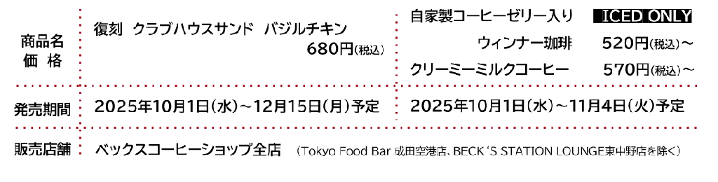 第3弾の目玉は、2000年に発売されて以降、21年間にわたりベックスコーヒーショップの人気メニューとして親しまれてきた「クラブハウスサンド バジルチキン」の復刻です。加えて、自家製コーヒーゼリーを使った2種の飲むスイーツドリンクを同日から販売します。