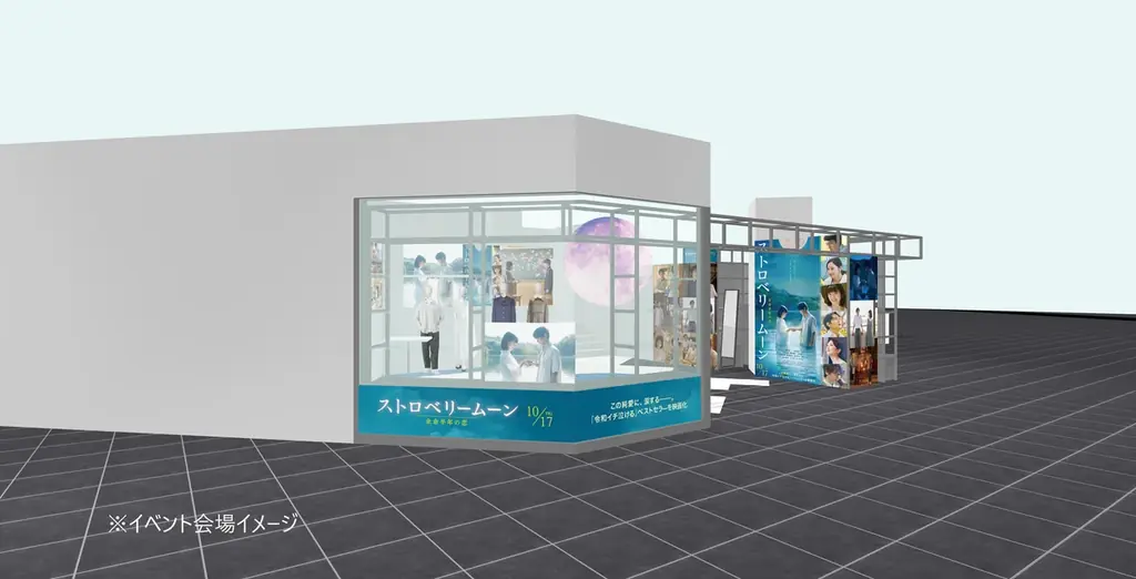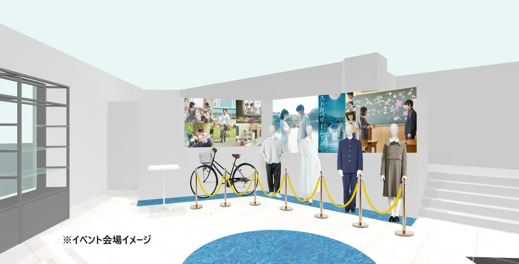 会場では映画の世界観を深める展示が行われます。展示内容は、作品を象徴する大型の「ストロベリームーン」モニュメント、劇中で使用された衣装・小道具、場面写真の掲出、そしてイベント限定の特別映像の放映などです。これらは写真や映像だけでなく、実物に触れられる展示を想定した構成となっています。