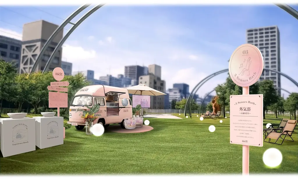 プロジェクトの第一弾イベントとして、都心に擬似入浴体験を展開するイベント「melt rest spot」を、2025年10月4日(土)より順次開催する。キーアイコンとなる移動ユニット「melt号」を起点に、東京・大阪・福岡の主要都市へ巡回し、都市生活の中心に“美の休息所”を設置する試みだ。