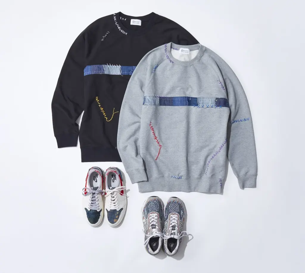 展示・販売の主な内容には、CSケーススタディ限定の別注クルーネックスウェット、〈KUON〉の一部最新アイテム、そして持ち込みスニーカーに刺し子を施すカスタムオーダー(予約制)があります。いずれも職人の手仕事による一点物の温かみを重視したラインナップです。