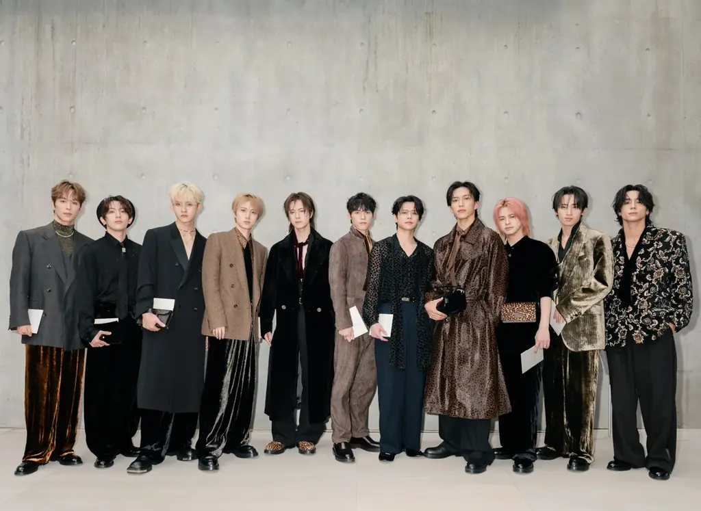 本ショーではウィメンズの2026年春夏コレクションが中心でしたが、注目点として日本からの特別来場者の存在が報告されています。以下に示すように、来場したのはグローバルボーイズグループINIの11名で、彼らはエンポリオ アルマーニ2025年秋冬メンズコレクションを身にまとって来場しました。