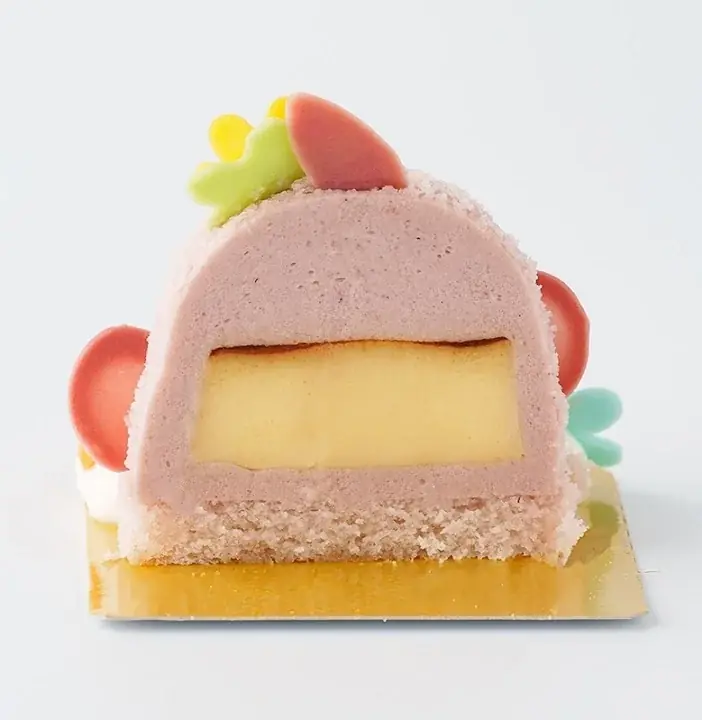 - 名古屋コーチンの卵を使った濃厚プリンを、いちご味のババロアで包み、花形のチョコレート(青・ピンク・オレンジ)を添付