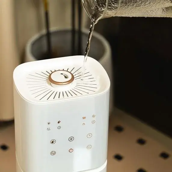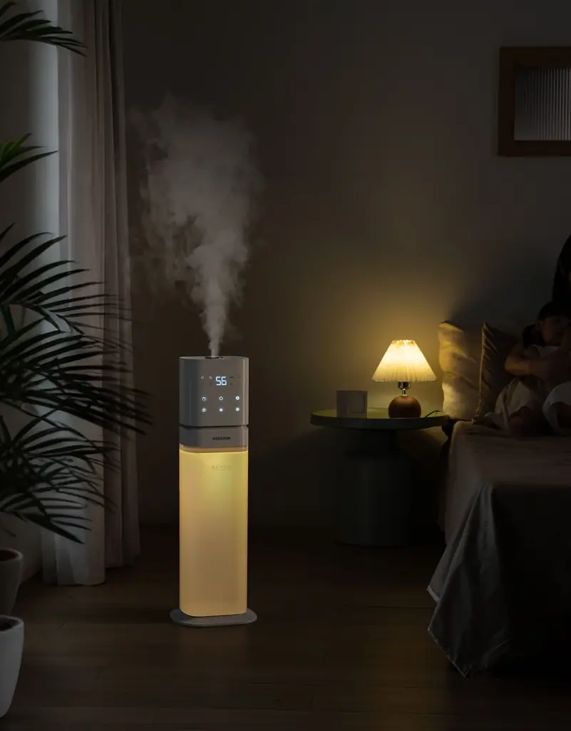 ムードライトは見た目のアクセントとしてだけでなく、間接照明としての実用性も想定されており、加湿器自体が照明的役割も兼ねられるため、ベッドサイドやリビングの落ち着いた雰囲気作りに寄与します。