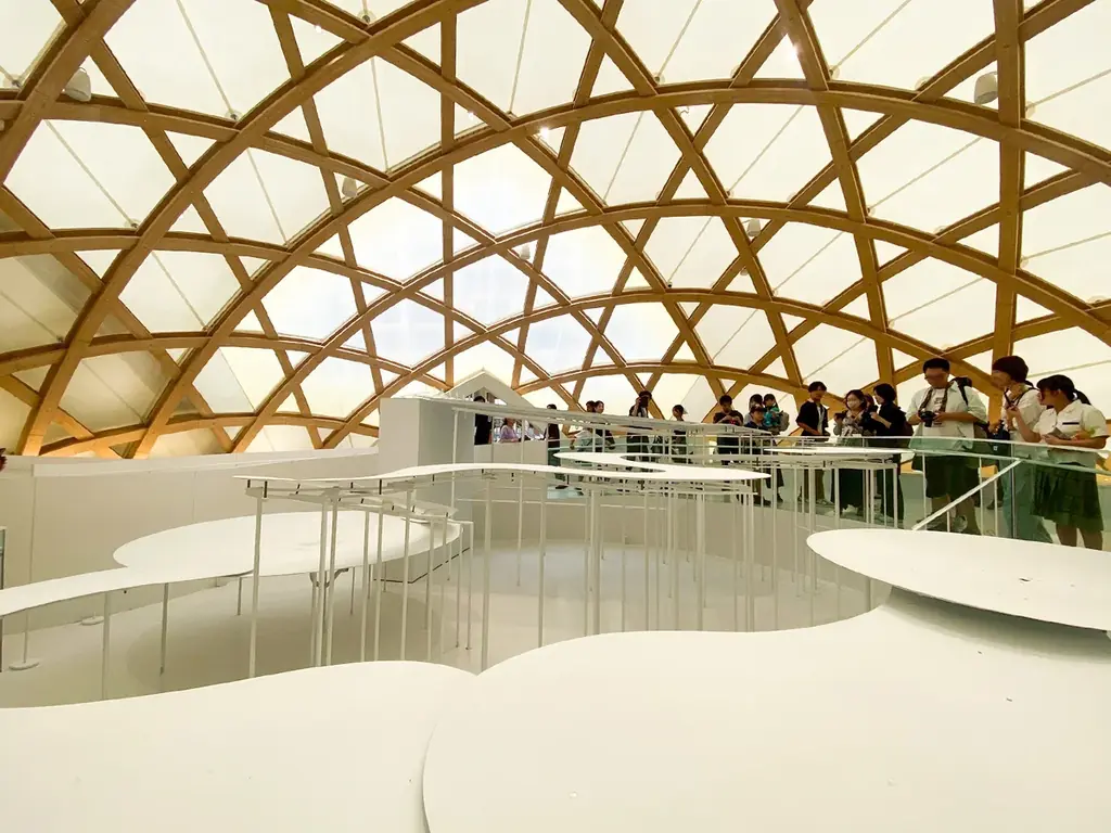 BLUE OCEAN DOMEは、2050年までに海洋プラスチックごみをゼロにする「大阪ブルー・オーシャン・ビジョン」を掲げるパビリオンで、展示・建築・体験設計それぞれに明確な思想があります。建築監修は万博テーマ事業プロデューサーであり建築家の坂茂(ばん・しげる)氏が担当し、紙管などの再生素材を活用した環境建築が特徴です。