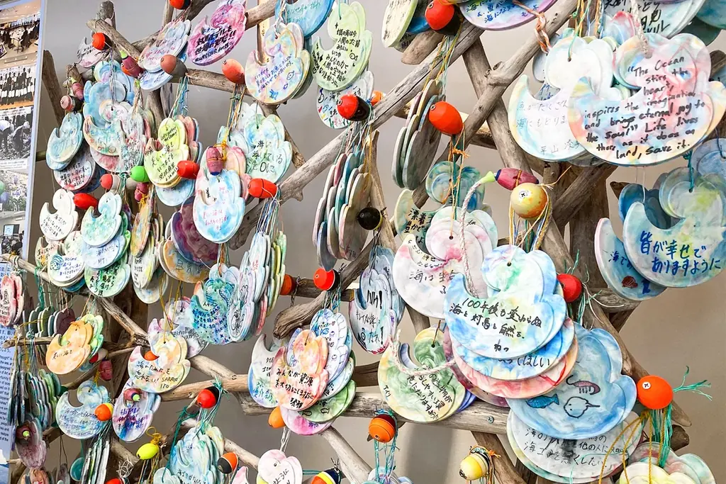 そのワークショップで生まれたのが、漂着プラスチックをアップサイクルして制作した『波絵馬』です。子どもたちや来場者が願いを書き込んだ波絵馬は、唐津市の離島や小学校にも展開され、約300枚が展示されるなど、世代や地域を越えた共感と参加が生まれました。
