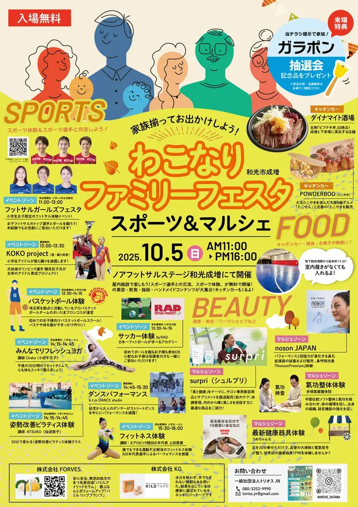 2025年10月5日(日)、ノアフットサルステージ和光成増にて開催される「わこなりファミリーフェスタ スポーツ&マルシェ」は、地域の企業やショップが一堂に会し、スポーツ体験とマルシェを融合させた一日限定のフェスです。開催時間は11時から16時で、入場は無料、雨天決行とされています。