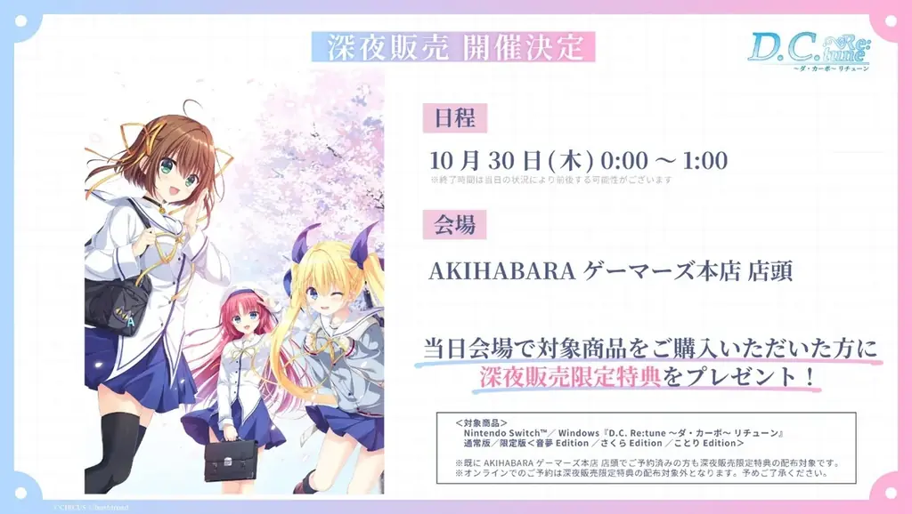 深夜販売 | 2025年10月30日(木) 0:00~1:00 AKIHABARAゲーマーズ本店(当日購入特典あり、詳細は追って発表) |
