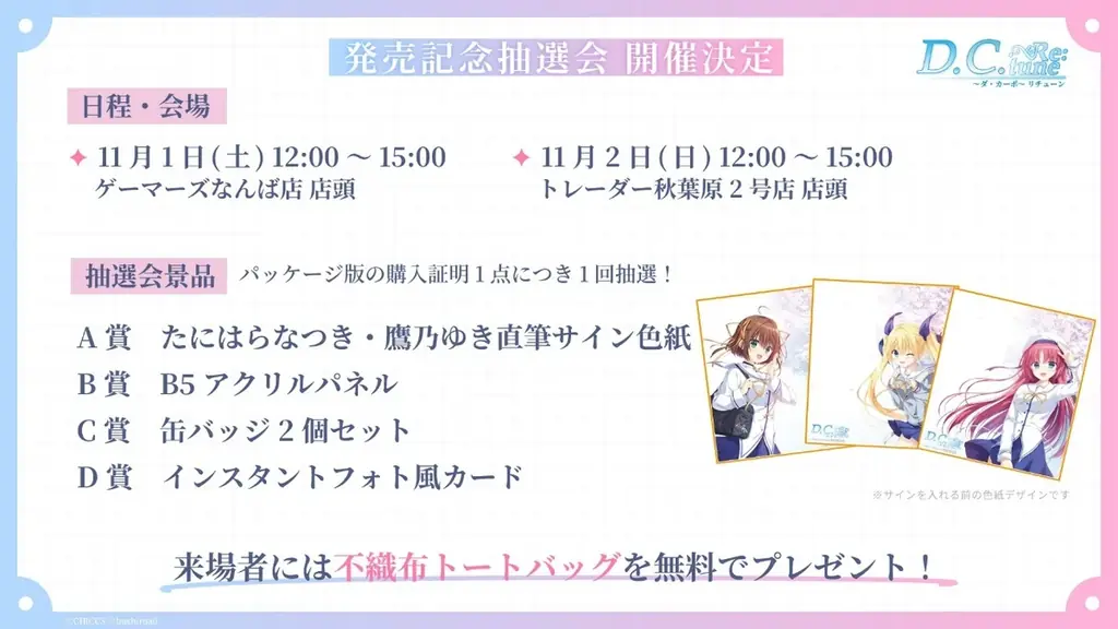 パッケージ版購入で参加可能な抽選会は、二会場で開催されます。各会場とも当日来場者に不織布トートバッグの無料配布があると発表されています。