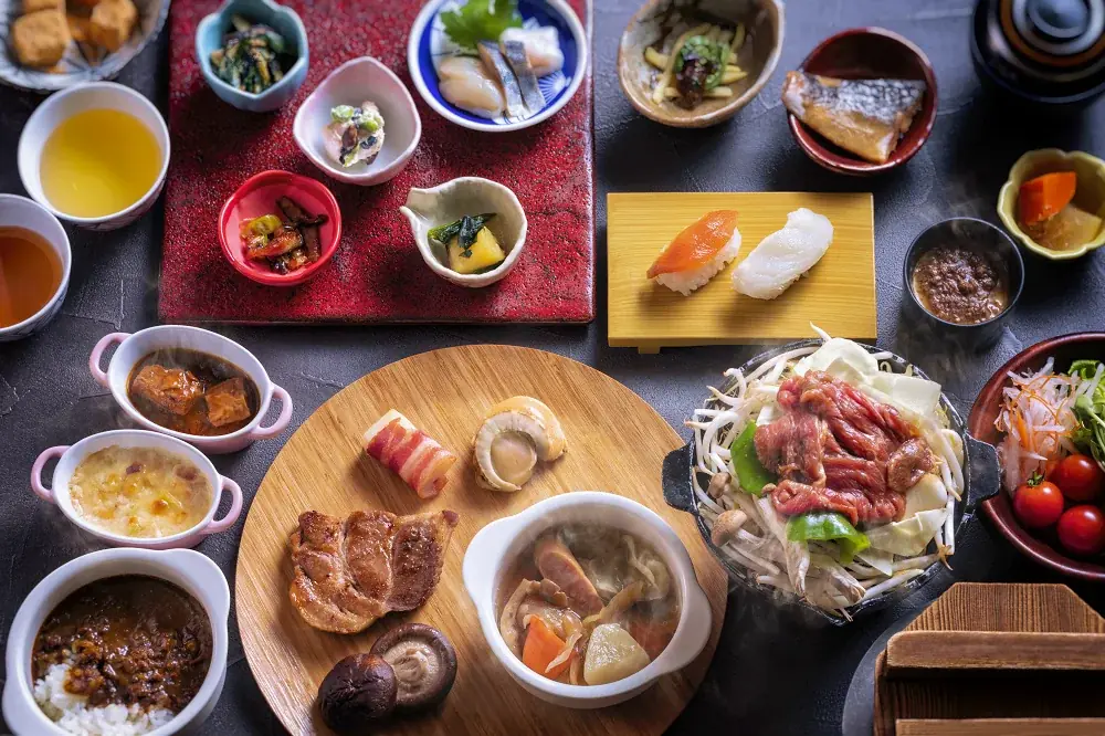 食事はバイキング形式の夕食が提供される日もあり、地酒の提供と併せて地元食材による献立を楽しむことができます。ロビーでのウェルカムドリンクは到着時の軽い一杯として提供されます。