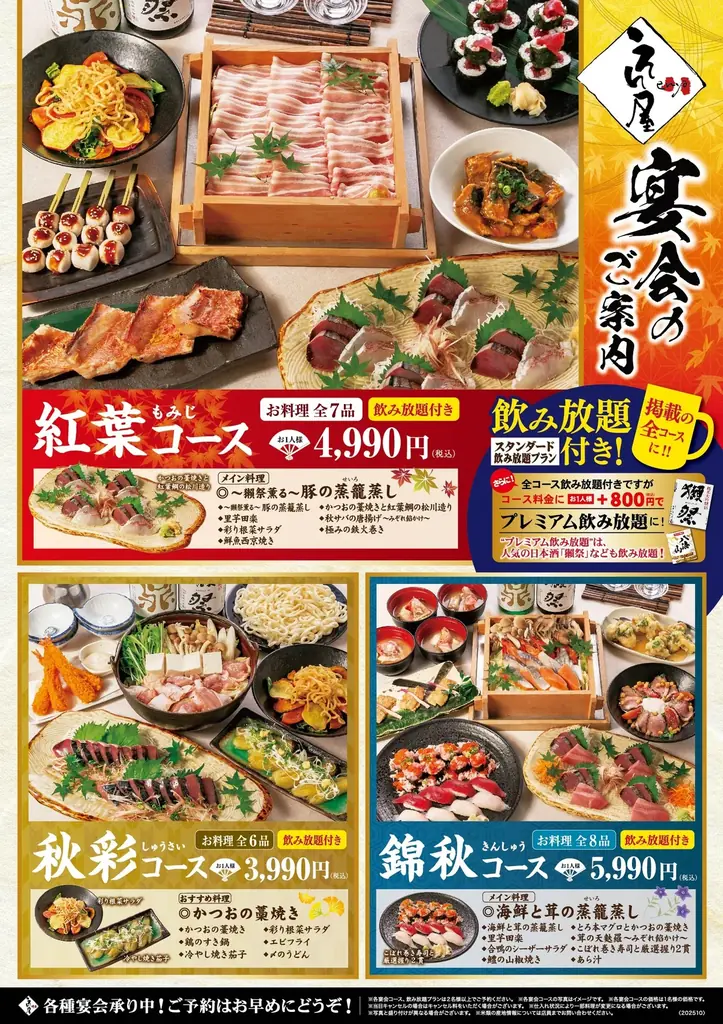 価格(税別は記載なし、税込表示) | 秋彩コース 3,990円、紅葉コース 4,990円、錦秋コース 5,990円(いずれも税込、1名) |