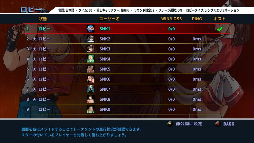 ロビー機能は最大9人まで参加可能で、待機中に観戦したりロビー内で順番を管理したりすることができます。観戦モードも実装されており、第三者が対戦を視聴することが可能です。
