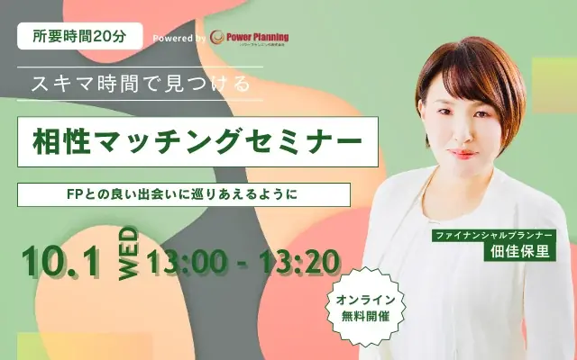 パワープランニング株式会社が運営する無料マネーセミナー提供サービス「アットセミナー」は、2025年10月1日(水)13時開始で、佃佳保里講師による「相性マッチングセミナー(無料)」をオンラインで開催します。本セミナーは、短時間で講師の人柄や相談のしやすさを確認し、自分に合ったファイナンシャルプランナー(FP)を指名できるマッチングを目的とした内容です。