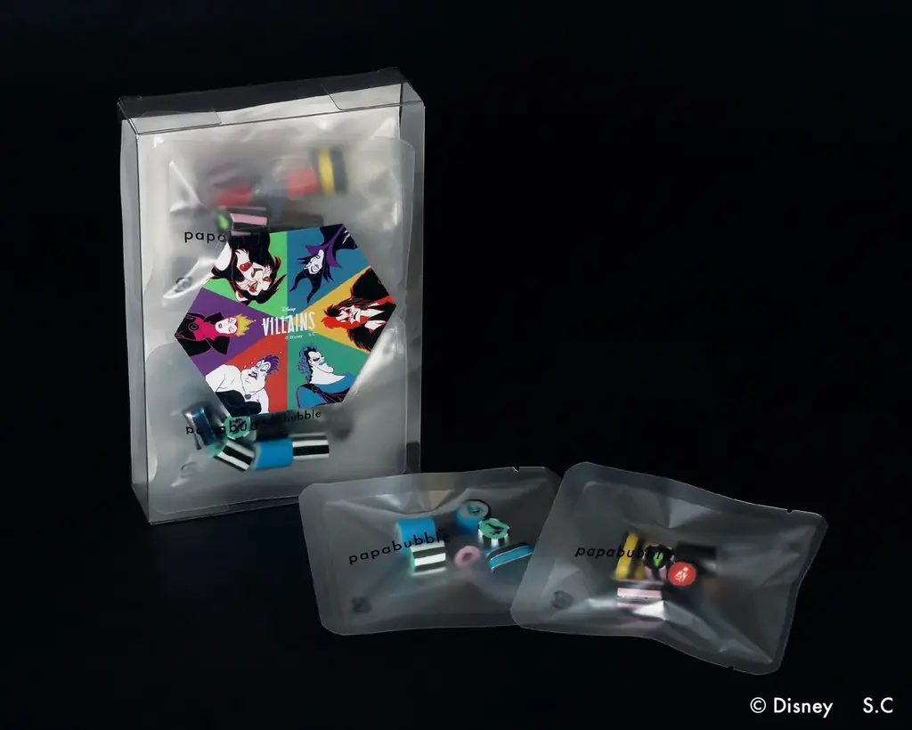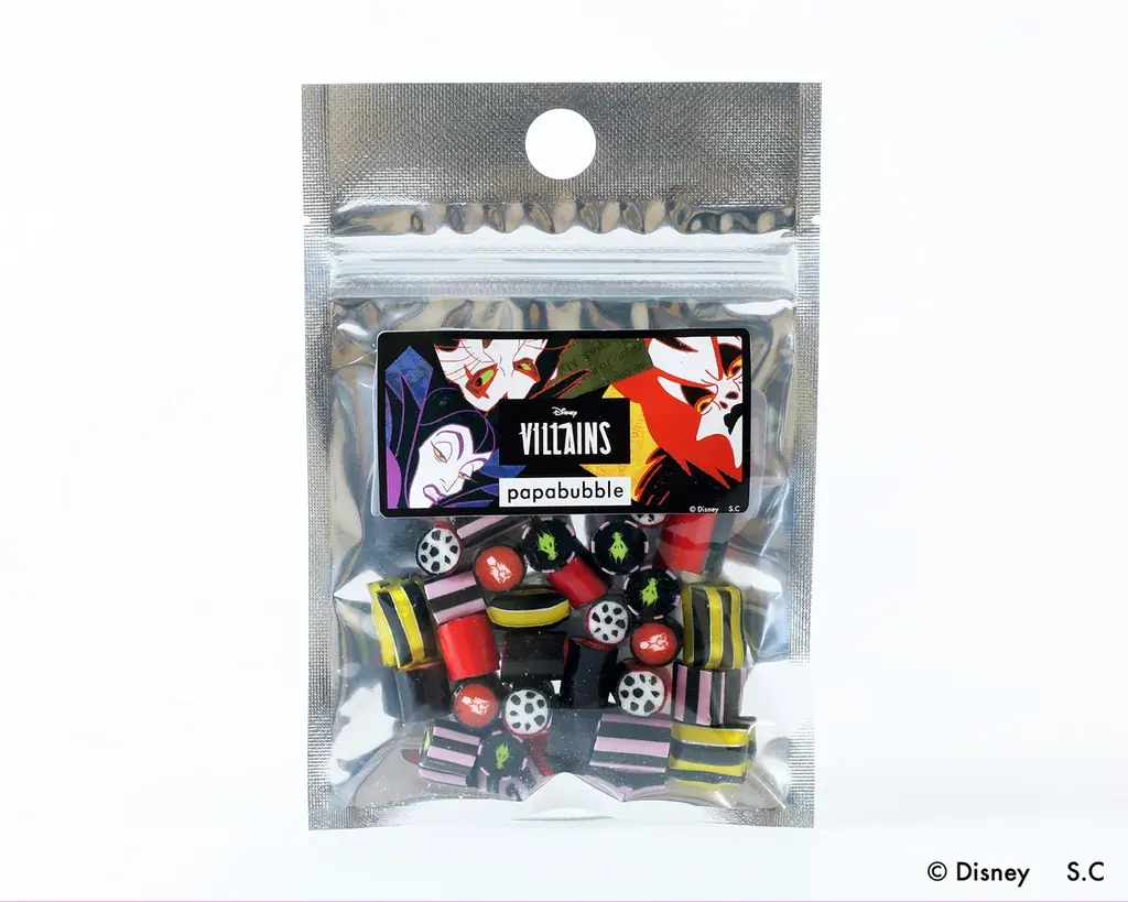 今回のコラボレーションは2023年以来の登場となるもので、ブラックを基調としたキャンディにヴィランズのアイコンを鮮やかなカラーであしらい、見た目のインパクトと味の個性を両立させた点が特徴です。パパブブレの職人が伝統的なアメ細工技術を用いて一粒一粒を仕上げ、ダークでありながら遊び心のある世界観を表現しています。