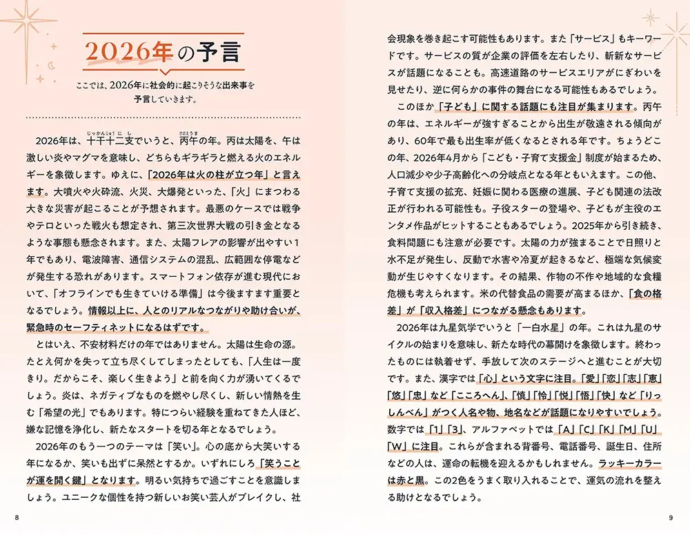 プレスリリースのタイトルが示すように、2026年のキーワードとして<火、笑い、子ども>が挙げられており、各巻はこれらのテーマ性や年全体の星回りをふまえた運勢の読み解きを行います。購入は書店に加え、Amazonや楽天ブックスからも可能です(Amazon商品ページ:https://amzn.asia/d/1EyilzP 楽天ブックス商品ページ:https://books.rakuten.co.jp/rb/18360611/)。詳細は出版社の公式ページでも案内されています(https://www.boutique-sha.co.jp/boutiqueblog/39039/)。