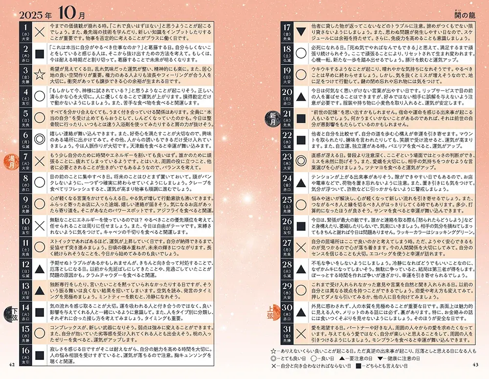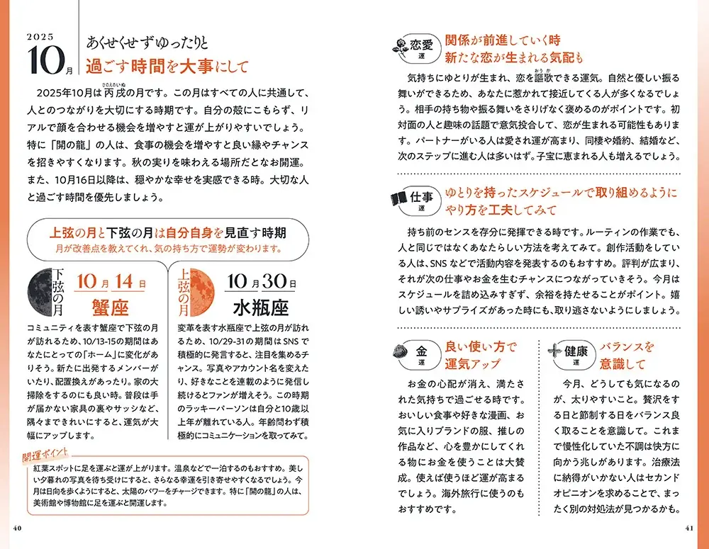 本書の構成は実用性を重視しており、日々の運勢活用ができるようカレンダー形式の収録(2025年10月~2026年12月)や、新月・満月ごとの星座別運勢、宿命数別の年間アドバイスが組み合わされています。個別の運勢は、守護龍別/宿命数別の詳細なガイドで合計60パターンが解説されています。