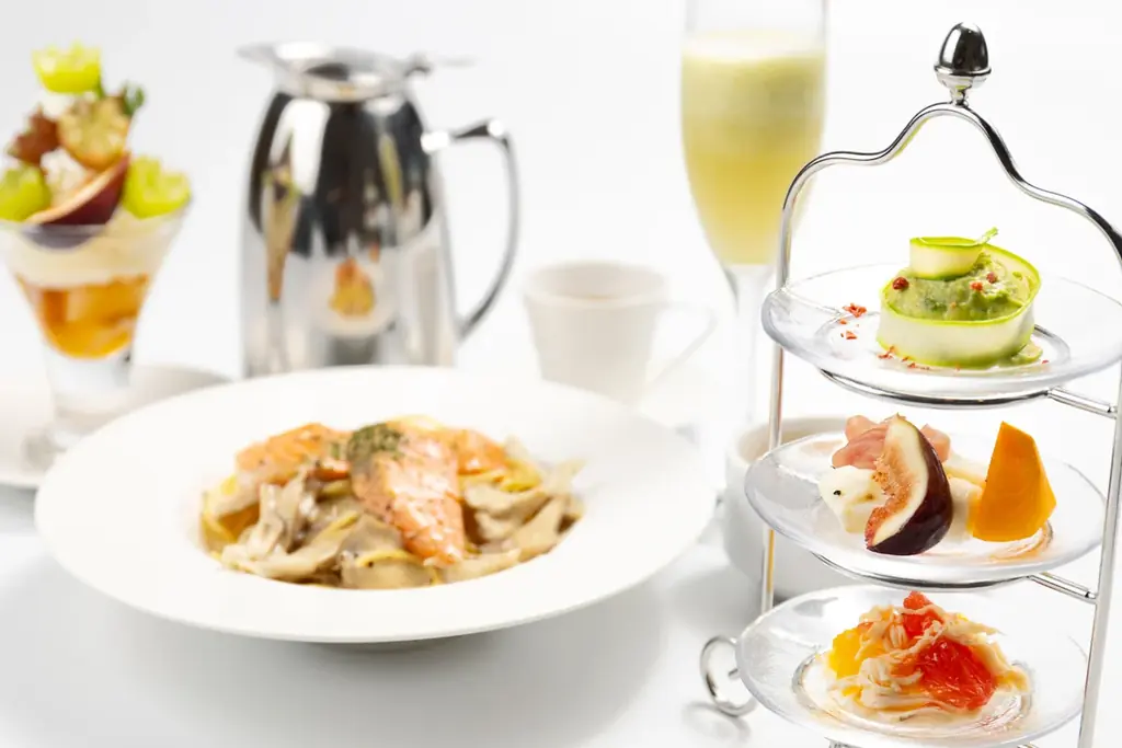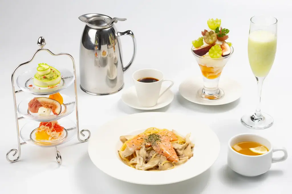 - セット内容:三段仕立てのフルーツオードブル / 季節のミニパフェ / 季節のスムージー / フルーツスープ(飲み放題) / ドリンク(コーヒーまたは紅茶、各HOT・ICE)