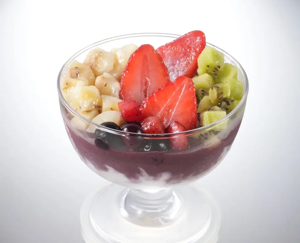 アサイーパフェはスーパーフードとしてのアサイーを取り入れつつ、ヨーグルト風味のアイスと複数のフルーツでバランス良くまとめたデザートです。バナナ、キウイ、イチゴが合わせられ、見た目と栄養面の両方に配慮した構成となっています。