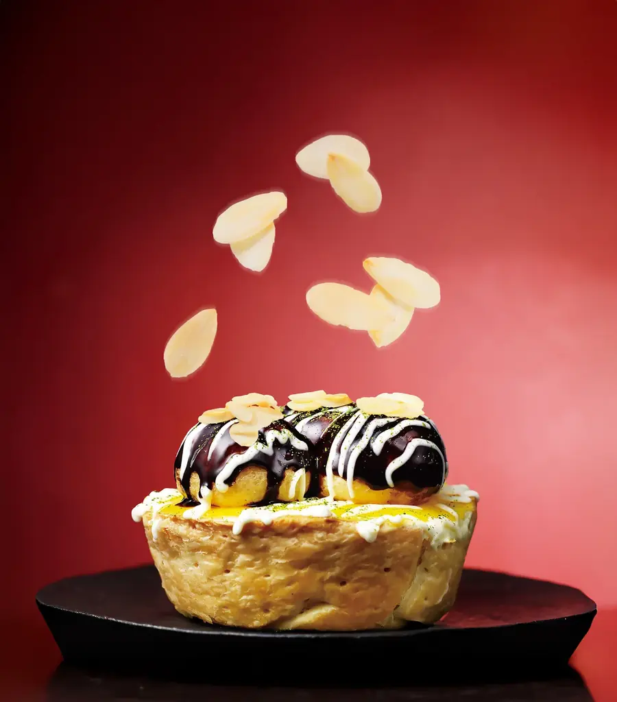 見た目の工夫として、アーモンドスライスがふわっと振りかけられ、その見た目はかつお節にも見える旨味表現として用いられています。外観は「たこ焼き」を想起させるが、実際にはチョコでコーティングした冷たいシュー生地であるため、食べたときの温度感や食感にギャップが生じる設計です。