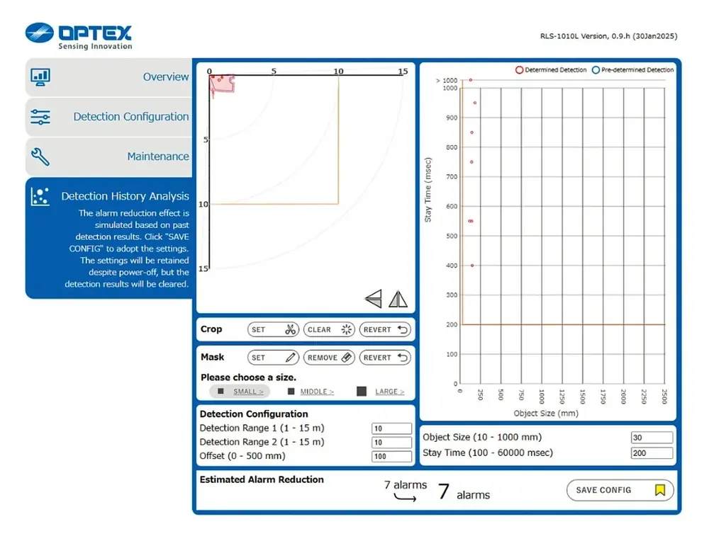 本製品には2つの新しい調整支援機能が搭載されています。1つはAuto Area Correction(特許出願中)で、電源投入だけで壁や床、フェンスなどを認識し、適切なサイズの検知エリアを自動構成します。もう1つはDetection History Analysis(特許出願中)で、過去100件の検知履歴を記憶し、設定変更による検知件数の減少をシミュレートする機能です。
