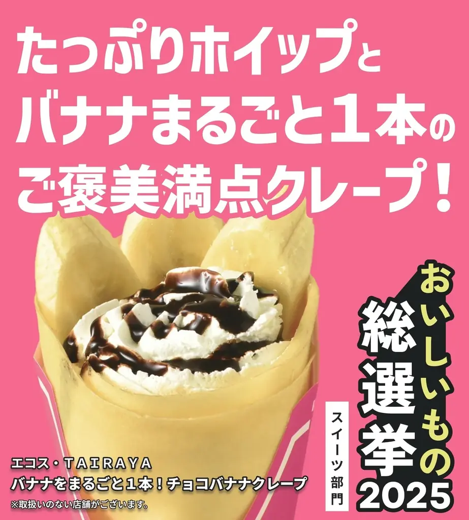 - バナナをまるごと1本!チョコバナナクレープ(エコスグループ) 販売エリア:東京、埼玉、神奈川、千葉、茨城、栃木、福島
