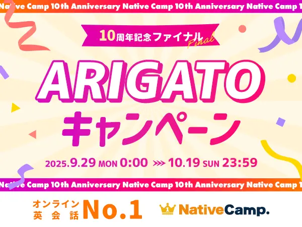 ネイティブスピーカーと回数無制限のオンライン英会話サービス「ネイティブキャンプ英会話」を提供する株式会社ネイティブキャンプは、サービス開始から10周年を迎えたことを受け、感謝を示す最終の企画として「ARIGATOキャンペーン」を実施します。リリースは2025年9月29日付けで発表され、キャンペーンは同日0:00に開始します。