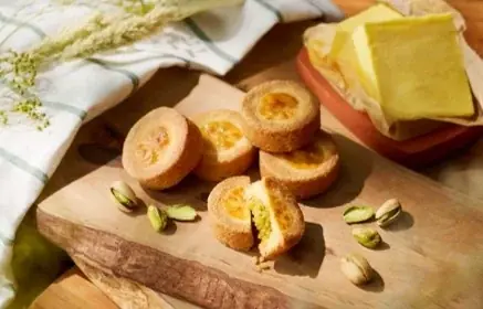 ガレット ピスタチオ&バター | 5個入 / 8個入 | 1,350円 / 2,160円 | 発酵バターを練り込んだサクサク生地にイタリア産ピスタチオペーストを封入、ゲランドの塩で味を引き締める |