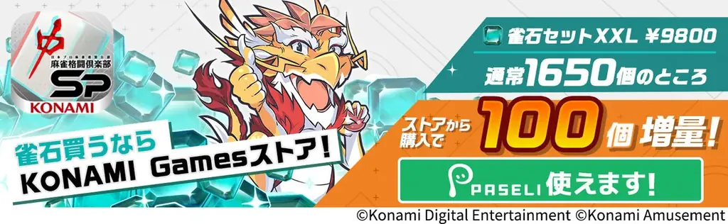 「KONAMI Gamesストア」ではゲーム内で使用するアイテム(雀石など)を購入できます。購入したアイテムはKONAMI IDに連携したゲームアカウントへ追加されます。決済手段としてクレジットカードや電子マネー「PASELI」などが利用可能です。