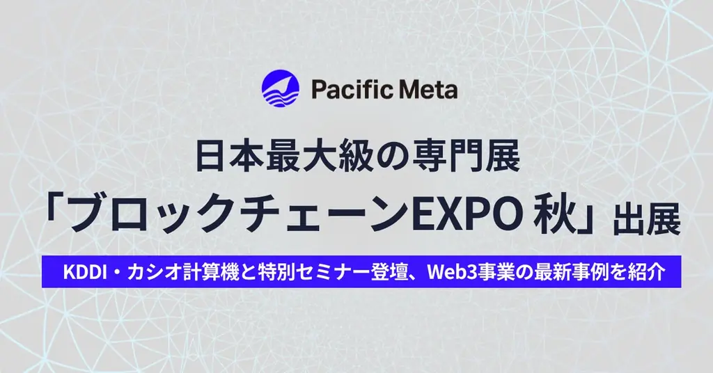 株式会社Pacific Meta(本社:東京都港区、代表取締役:岩崎 翔太)は、2025年10月8日(水)~10日(金)に幕張メッセで開催される「第6回 ブロックチェーンEXPO【秋】」(NexTech Week 2025【秋】内)に出展します。本展示会はブロックチェーン技術やWeb3に関する最新ソリューションやビジネス事例が一堂に会する日本最大級の専門展であり、多様な企業・団体が一堂に会する場となります。