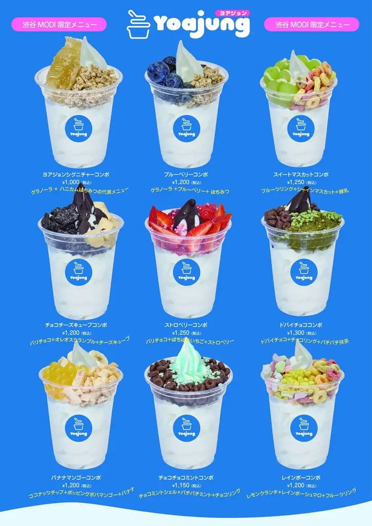 渋谷モディ限定で提供されるYOAJUNGのメニューは、すべて自家製フローズンヨーグルトをベースとした“9種類のシングルカップ”という形で展開されます。各カップは、コムハニー(はちみつの巣)を載せることを特徴とし、グラノーラ、各種ベリー、季節のフルーツ、チョコレートやクッキー、カラフルシリアルなどを組み合わせて構成されます。