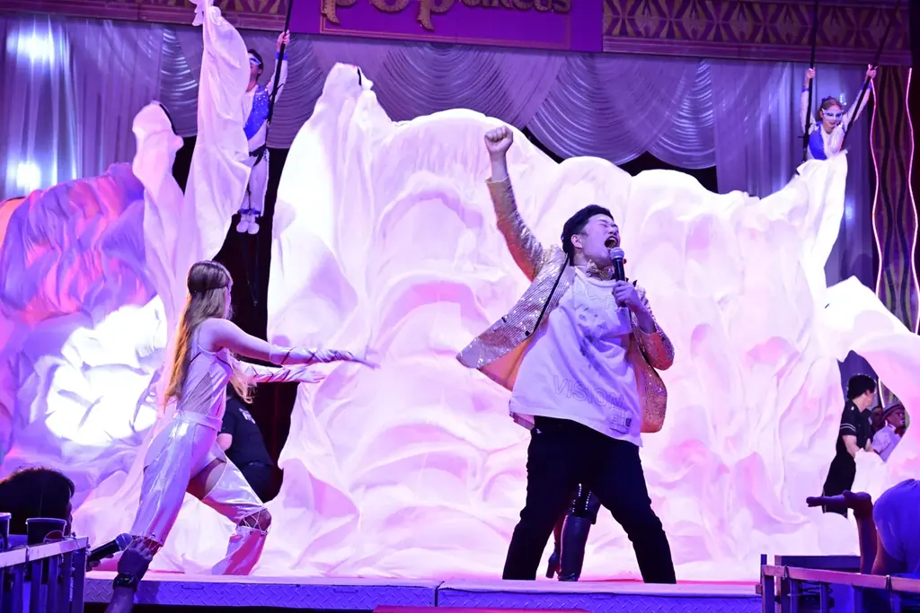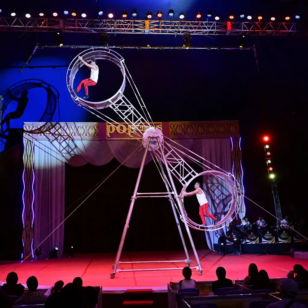 ポップサーカス東大阪公演では、空中ブランコやアクロバット、ジャグリングなど、世界トップレベルのパフォーマンスが次々と披露されます。舞台は迫力とスリルを重視しつつ、クラウンによるユーモアの要素も織り交ぜられており、観客層に合わせた構成がなされています。