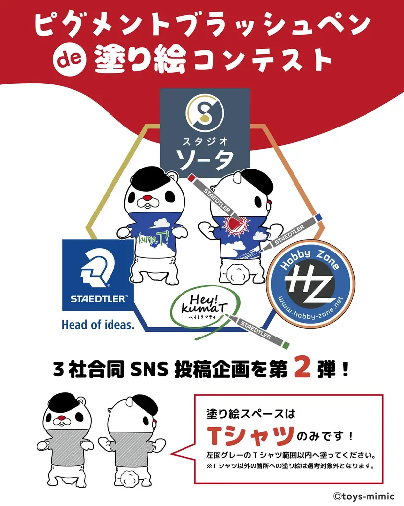 応募方法(コンテスト) | ピグメントブラッシュペン購入→塗り絵(Tシャツ部分を7色まで)→作品とペンを写真撮影→ホビーゾーン公式アカウント(@HZ_SNScon)をフォロー→Xへ「#クマティ塗り絵」を付けて投稿 |