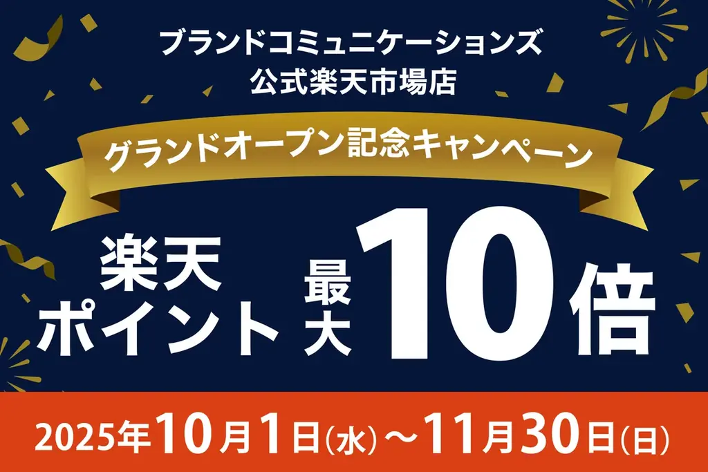 オープンを記念し、ブランドコミュニケーションズ楽天市場店で商品を購入した方を対象に楽天ポイントを最大10倍付与するキャンペーンを実施します。キャンペーン期間は2025年10月1日〜2025年11月30日(日)です。